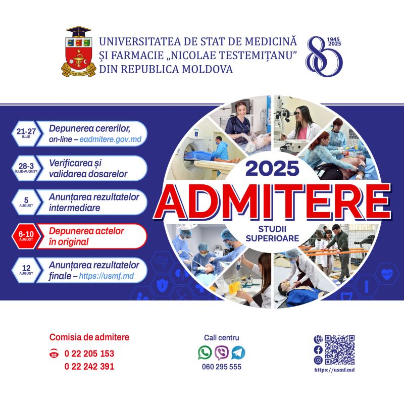 Universitatea de Stat de Medicină și Farmacie „Nicolae Testemițanu” din Republica Moldova anunță cea de-a 4-a etapă a concursului de admitere – depunerea actelor în original, în perioada 6-10 august 2025. Candidații la studii care optează pentru programe în domeniul general 091.Sănătate, inclusiv cei care nu au promovat concursul intermediar de admitere, dar doresc să participe la concursul final, trebuie să depună documentele în termenele stabilite.